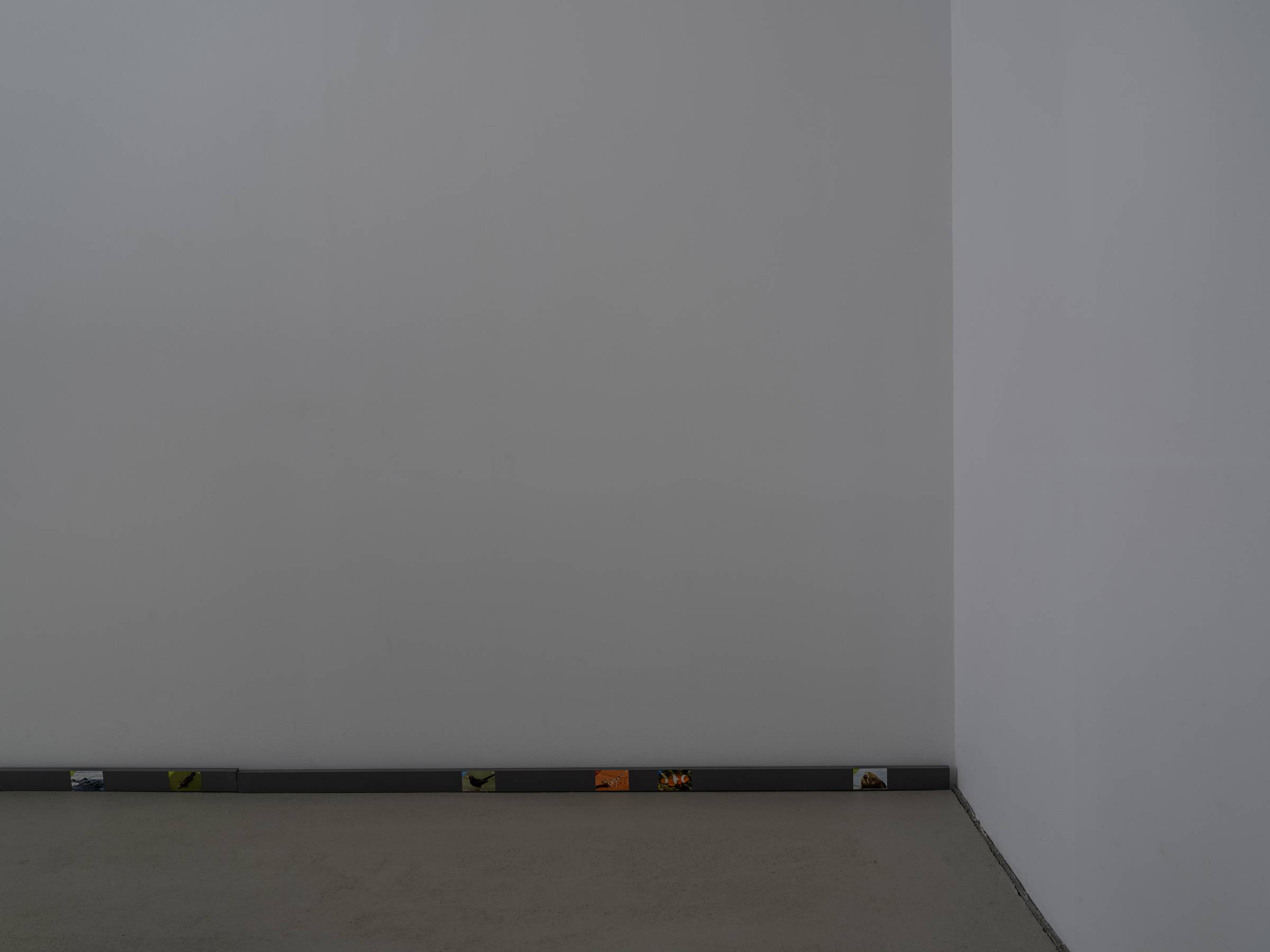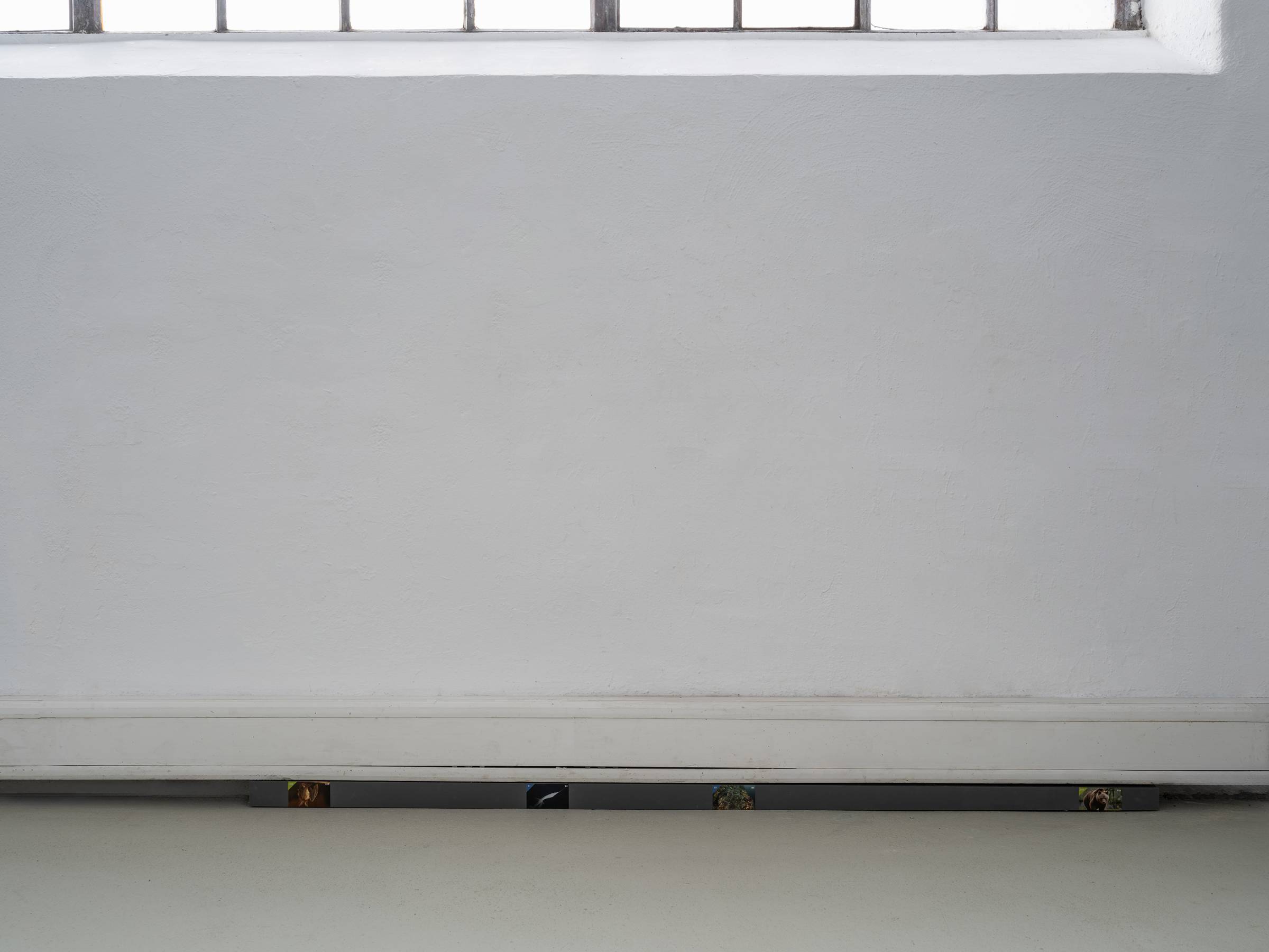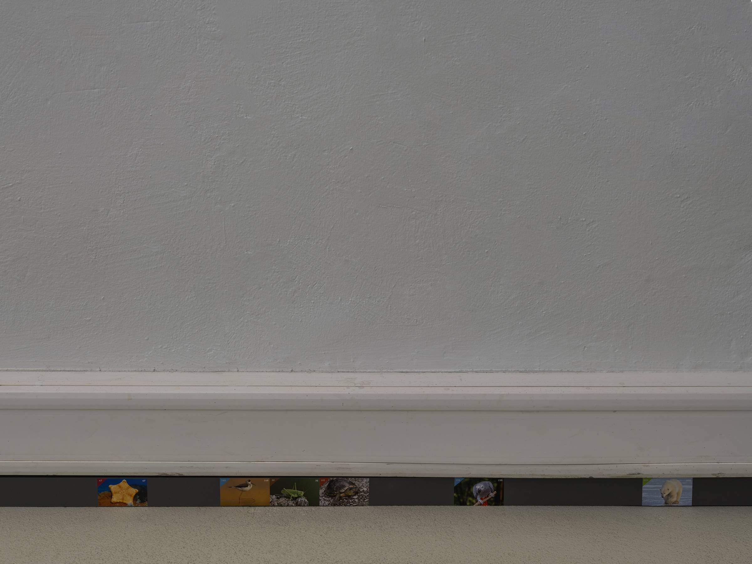 Die Videoarbeit wird ergänzt durch die Installation Enumerate candidates, 2024–26, die auf einegängige Tradition unter anderem in osteuropäischen Ländern anspielt: Gemüse wird eingelegt, konserviert und in Einmachgläsern in vereinfachte, standardisierte Tierformen zugeschnitten. Daran anschließend zeigt die entlang der Wandleisten verlaufende Installation Unseen behavior, 2024–26, eine Aneinanderreihung von Tierstickern, angelegt wie ein enzyklopädisches Ordnungssystem. Diese stammen aus einer kroatischen Schokolade mit Sammelbildern, die den Anspruch verfolgt, eine möglichst große Bandbreite lebender Tierarten abzubilden. Beide Arbeiten reflektieren, wie kulturelle Systeme anthropozentrische Ordnungs- und Darstellungsmuster erzeugen, und thematisieren zugleich Fragen von Standardisierung und Katalogisierung.
