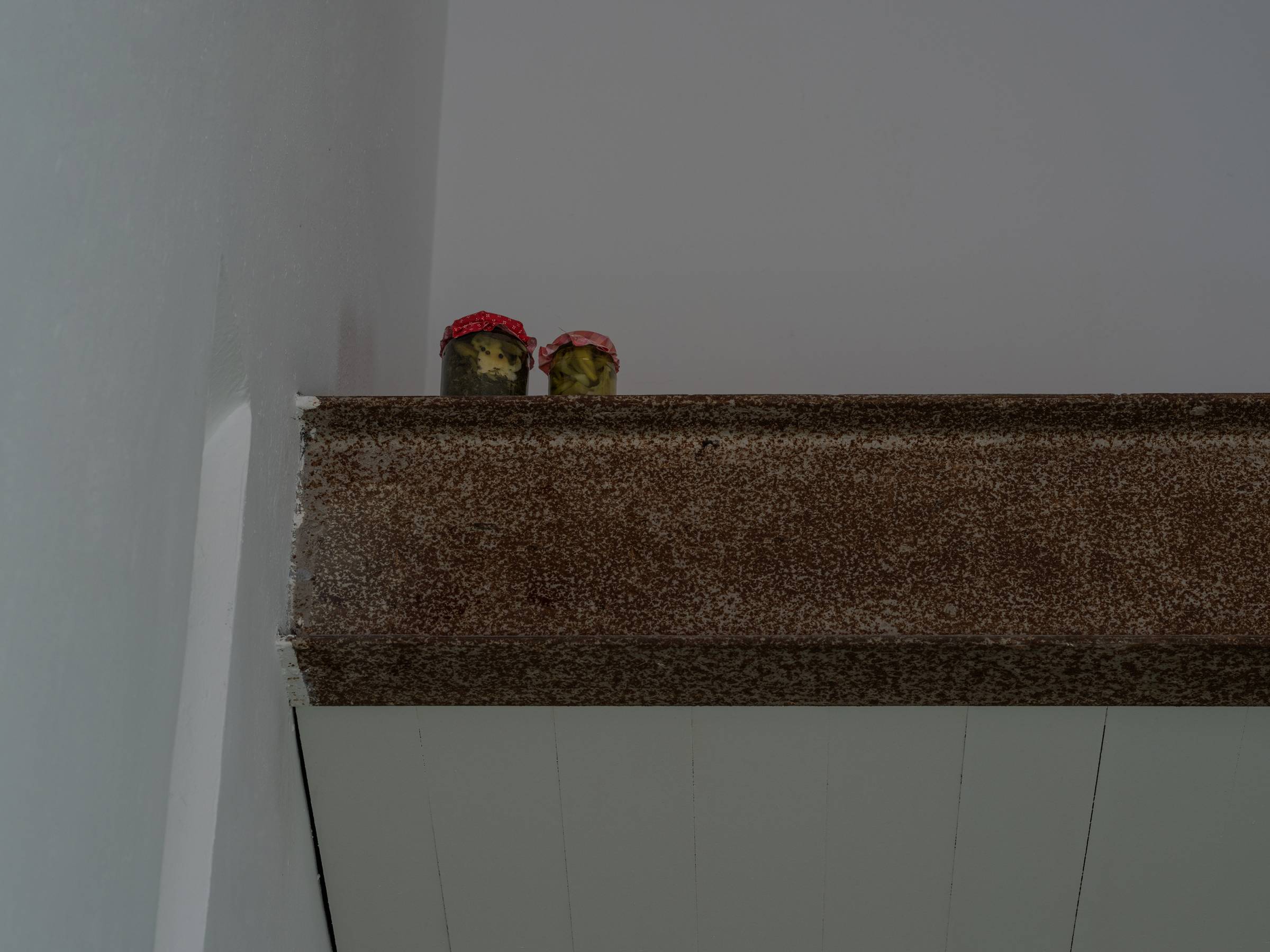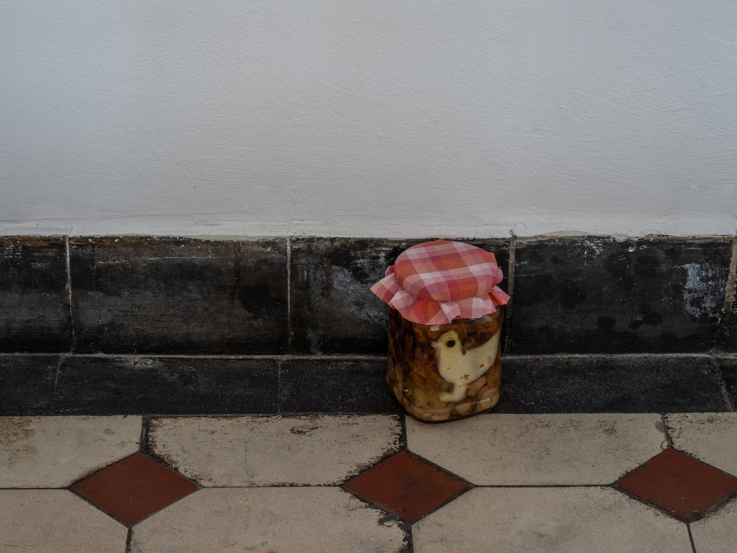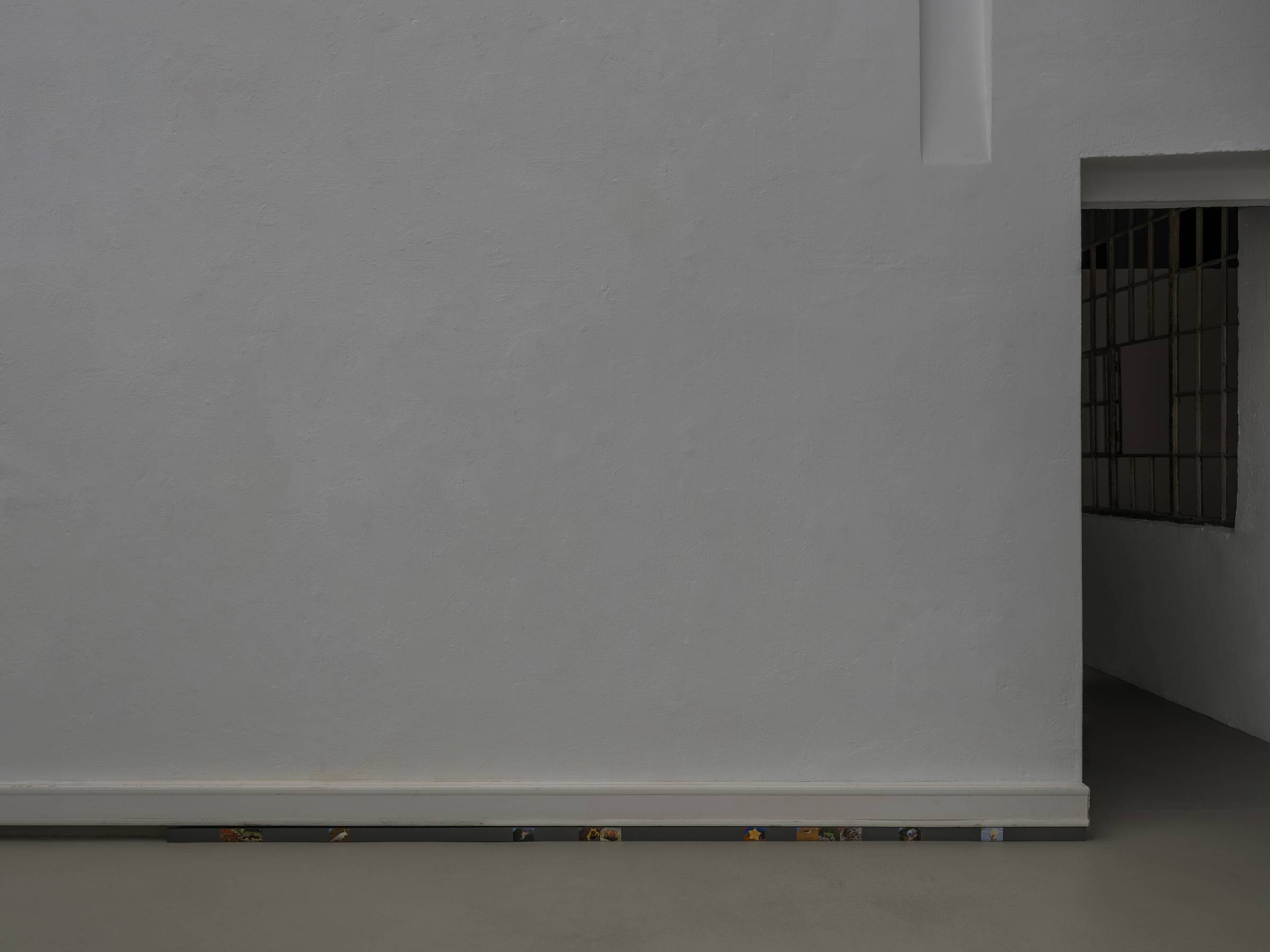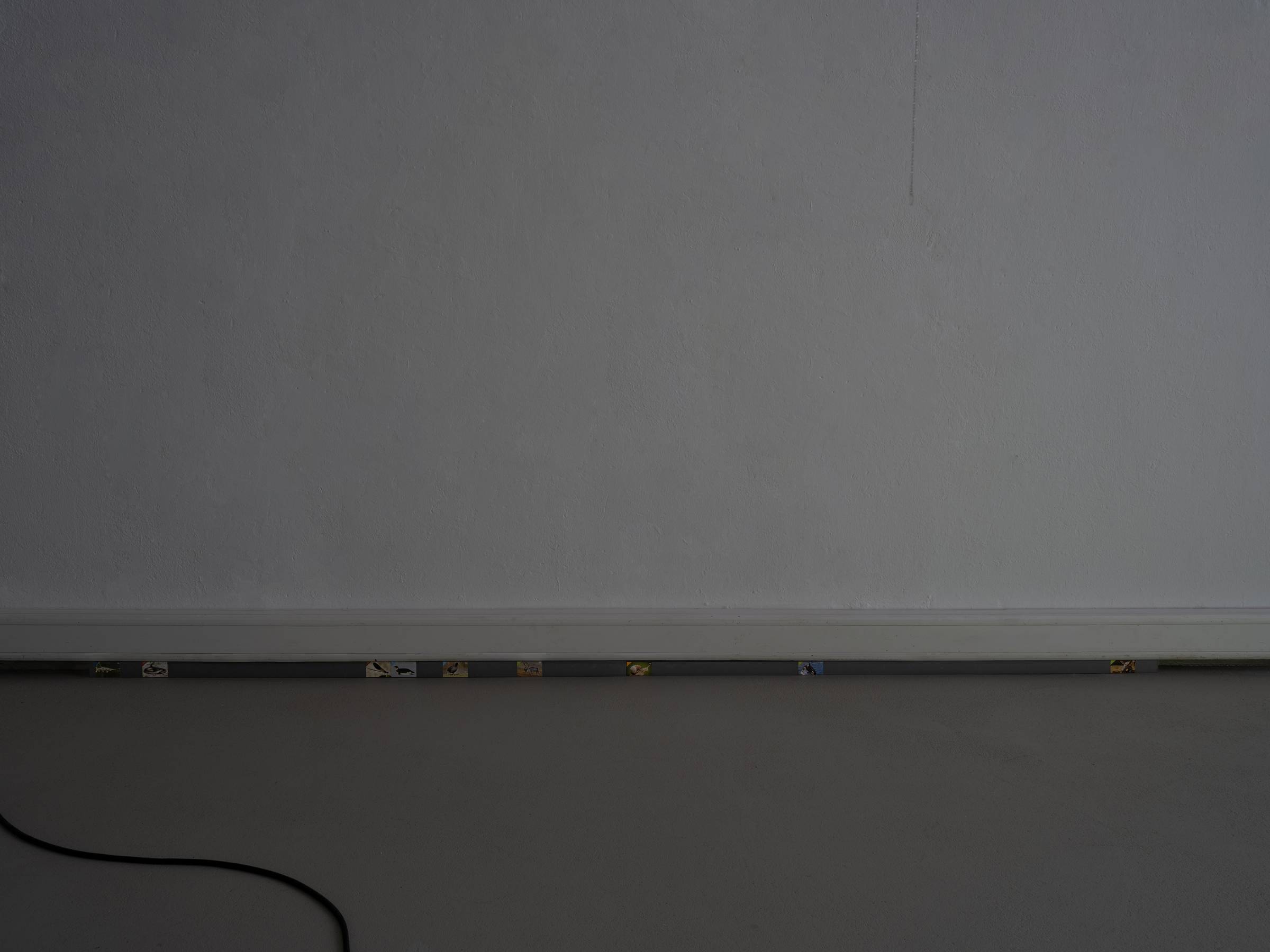 Die Videoarbeit wird ergänzt durch die Installation Enumerate candidates, 2024–26, die auf einegängige Tradition unter anderem in osteuropäischen Ländern anspielt: Gemüse wird eingelegt, konserviert und in Einmachgläsern in vereinfachte, standardisierte Tierformen zugeschnitten. Daran anschließend zeigt die entlang der Wandleisten verlaufende Installation Unseen behavior, 2024–26, eine Aneinanderreihung von Tierstickern, angelegt wie ein enzyklopädisches Ordnungssystem. Diese stammen aus einer kroatischen Schokolade mit Sammelbildern, die den Anspruch verfolgt, eine möglichst große Bandbreite lebender Tierarten abzubilden. Beide Arbeiten reflektieren, wie kulturelle Systeme anthropozentrische Ordnungs- und Darstellungsmuster erzeugen, und thematisieren zugleich Fragen von Standardisierung und Katalogisierung.