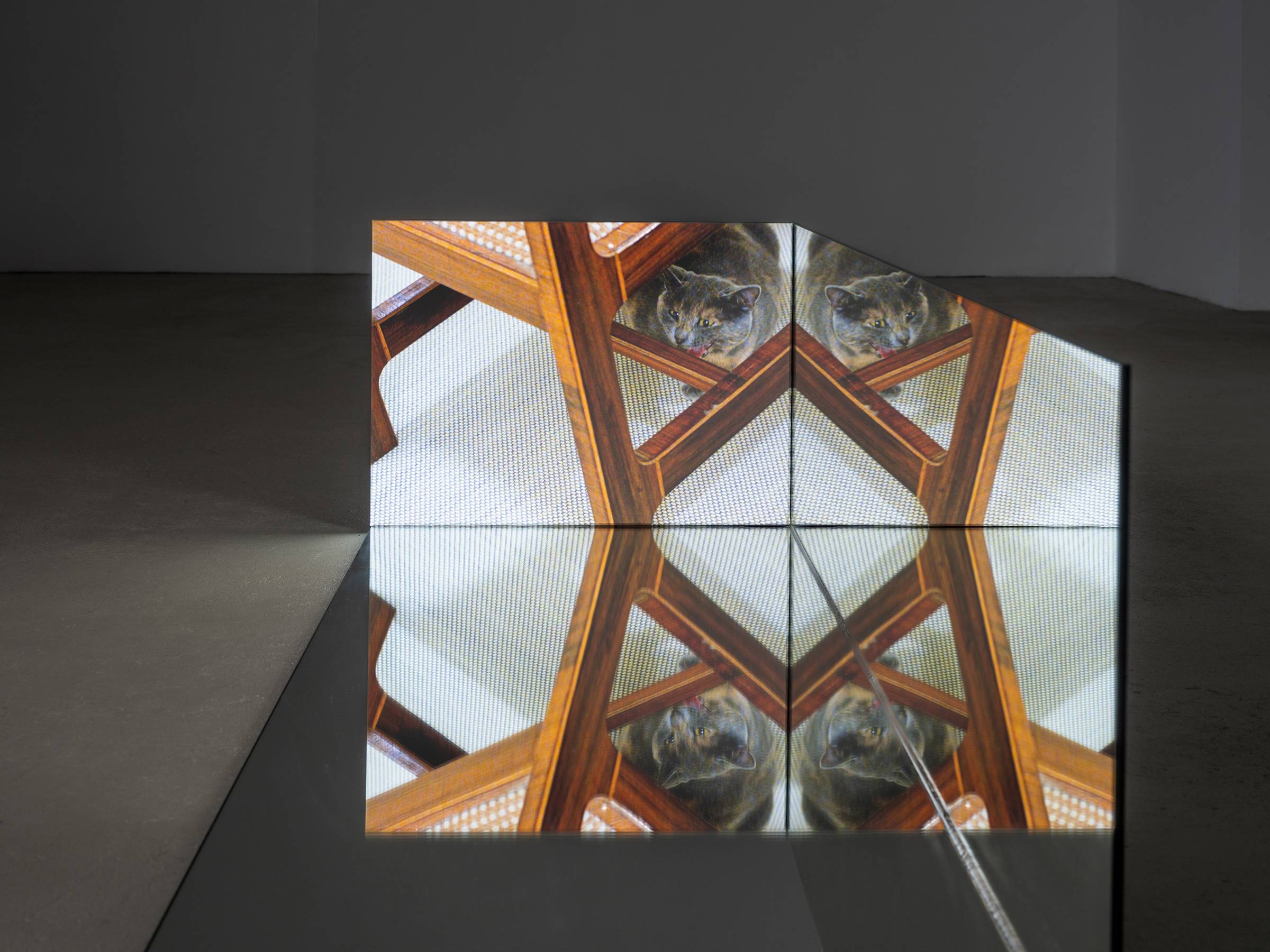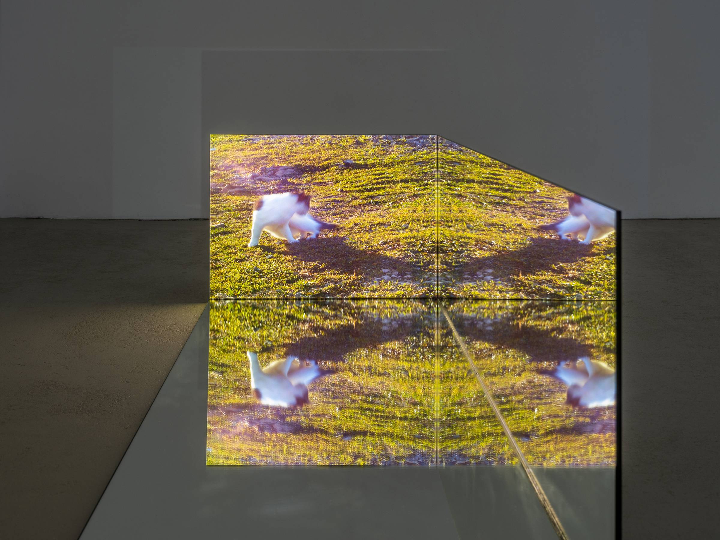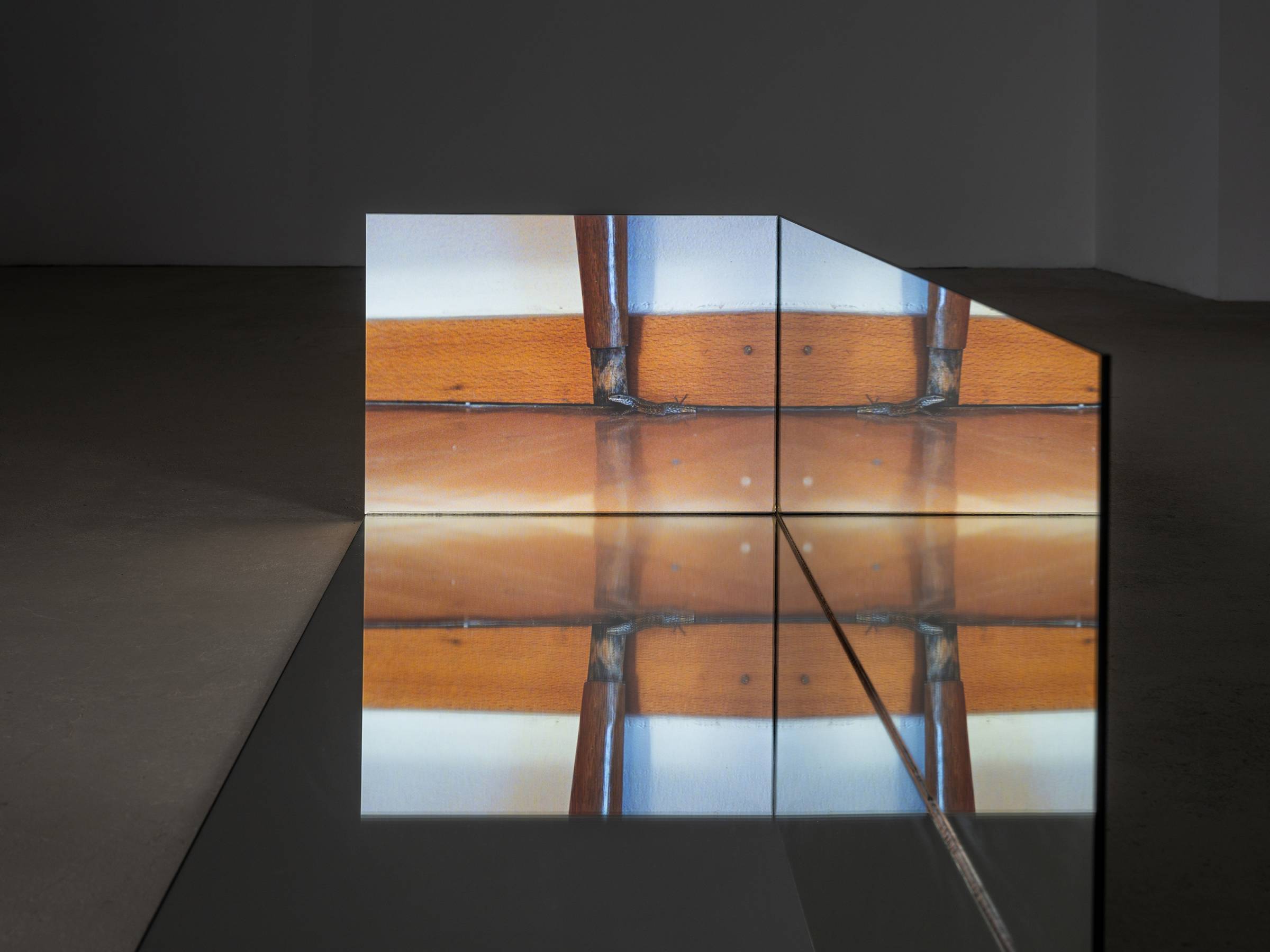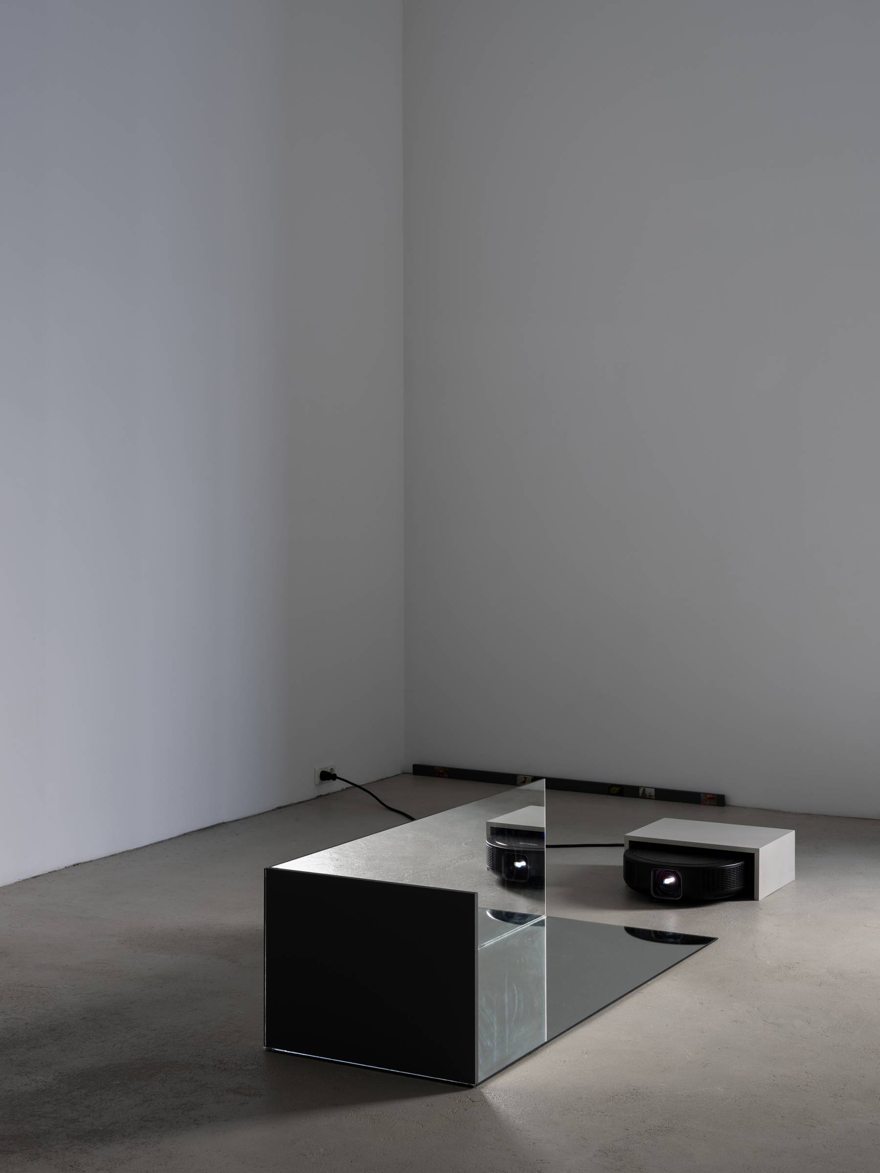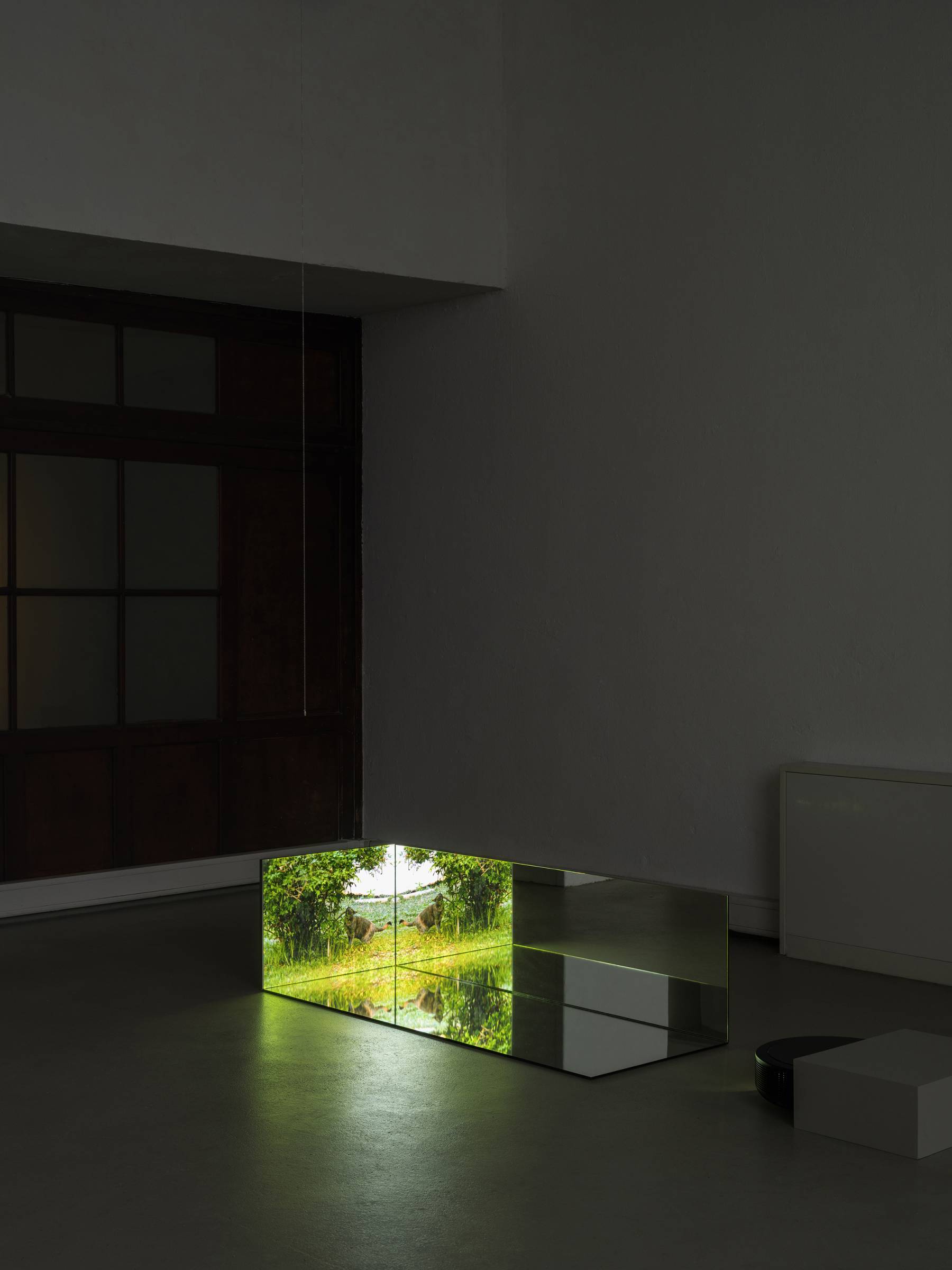 Durch die skulpturale Einbettung der fünf Videokanäle in die verspiegelten Raumrelikte generieren die Bilder immer wieder neue Muster, die auch ihre unmittelbare Umgebung in Beziehung zum Gezeigten setzen. Die Videos werden punktuell von kurzen Sequenzen früherer Arbeiten durchzogen, in denen die Verhaltensweisen anderer Tiere wie Hühner oder Käfer im Mittelpunkt stehen. Vor den projizierten Bildern hängen auf unterschiedlichen Augenhöhen von der Decke herab Metallketten, an denen Zerstreuungslinsen befestigt sind. Je nach Blickwinkel greifen sie in die Projektionen ein, komprimieren einzelne Bildausschnitte und verschieben so den Fokus des Geschehens. Auf subtile Weise erweitert Ramić damit das narrative Gefüge der Ausstellung und verschränkt vermeintlich objektive Geschichtsschreibung mit subjektiver Erfahrung. So bindet sie nicht nur ihre persönliche Auseinandersetzung mit ihrer postmigrantischen Biografie in die unterschiedlichen historischen und geografischen Kontexte ein, sondern macht gleichzeitig auch den fortlaufenden Prozess ihrer künstlerischen Reflexion sichtbar sowie die Umgebung und Perspektive der Betrachtenden.