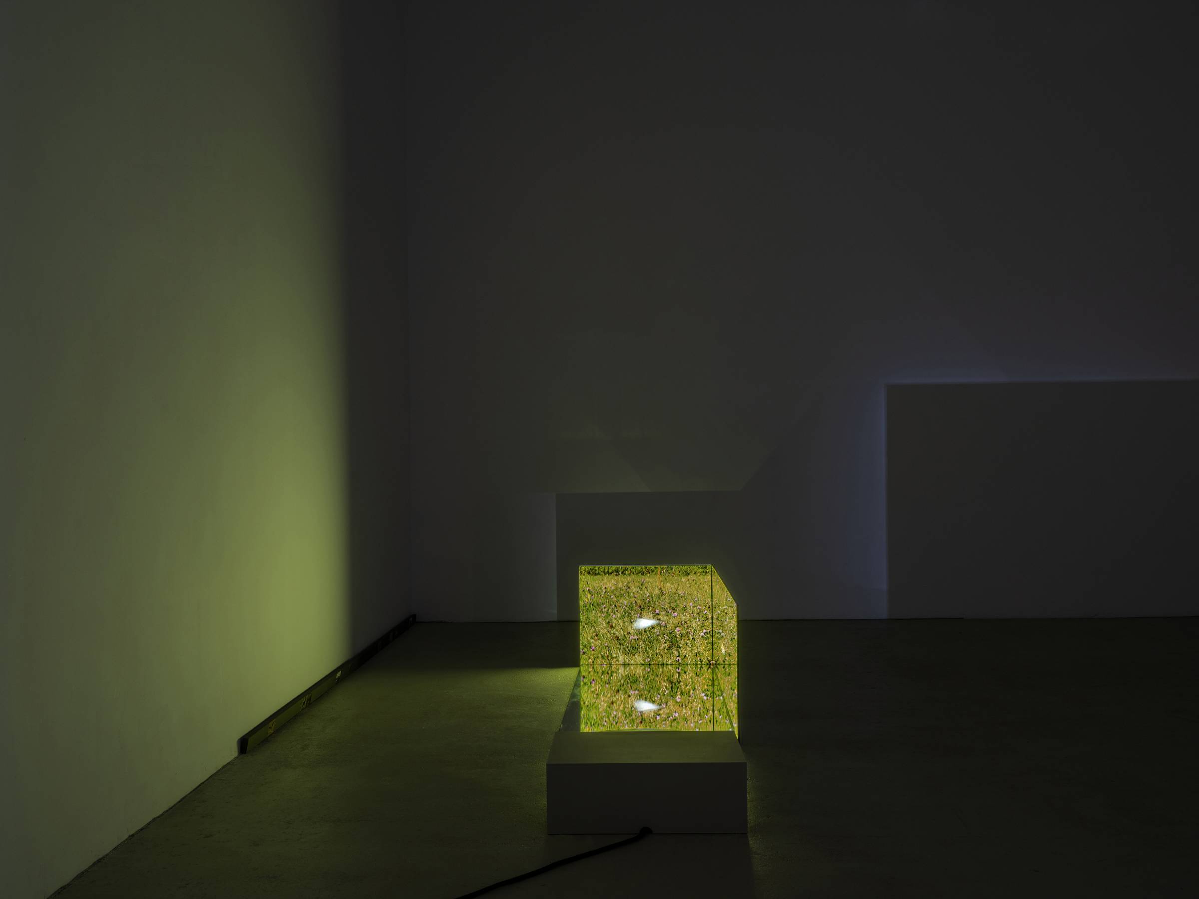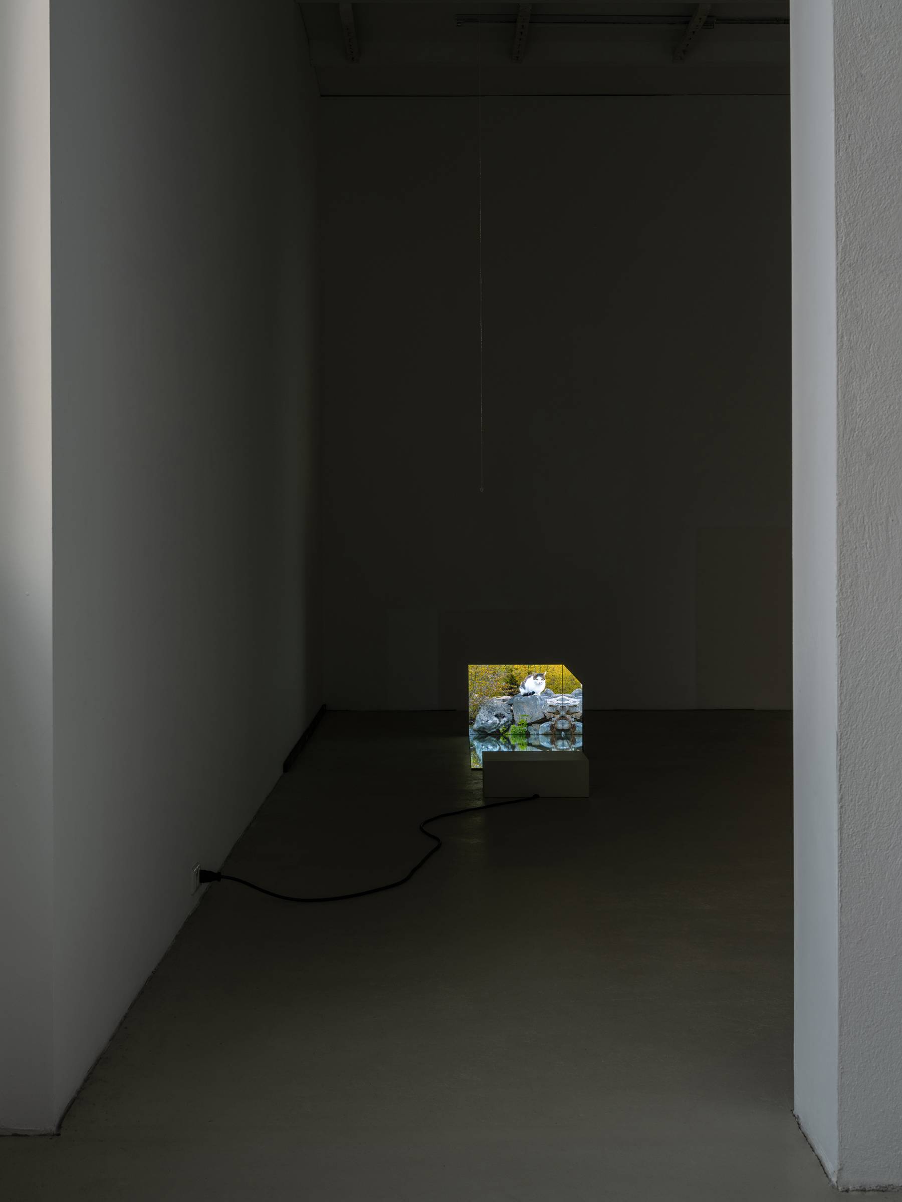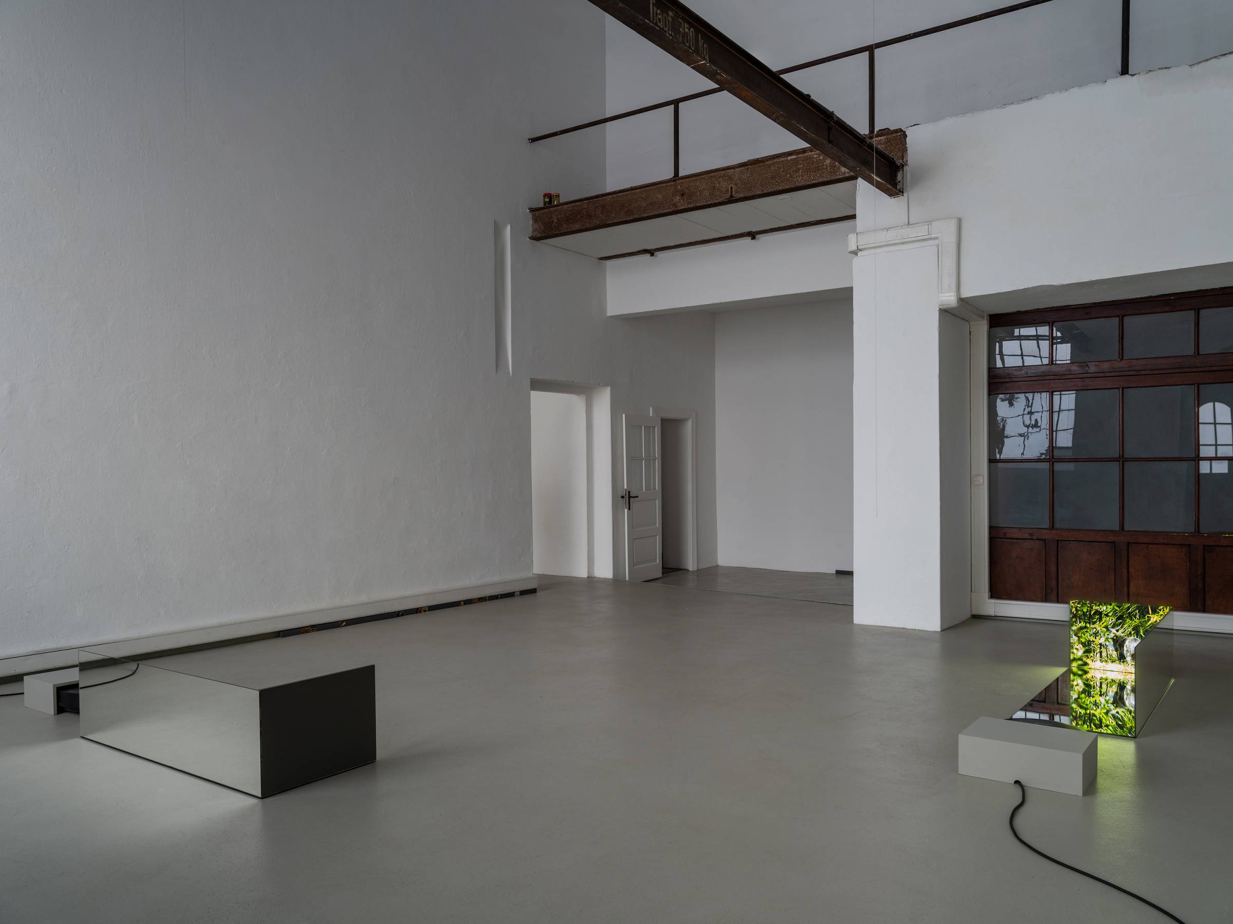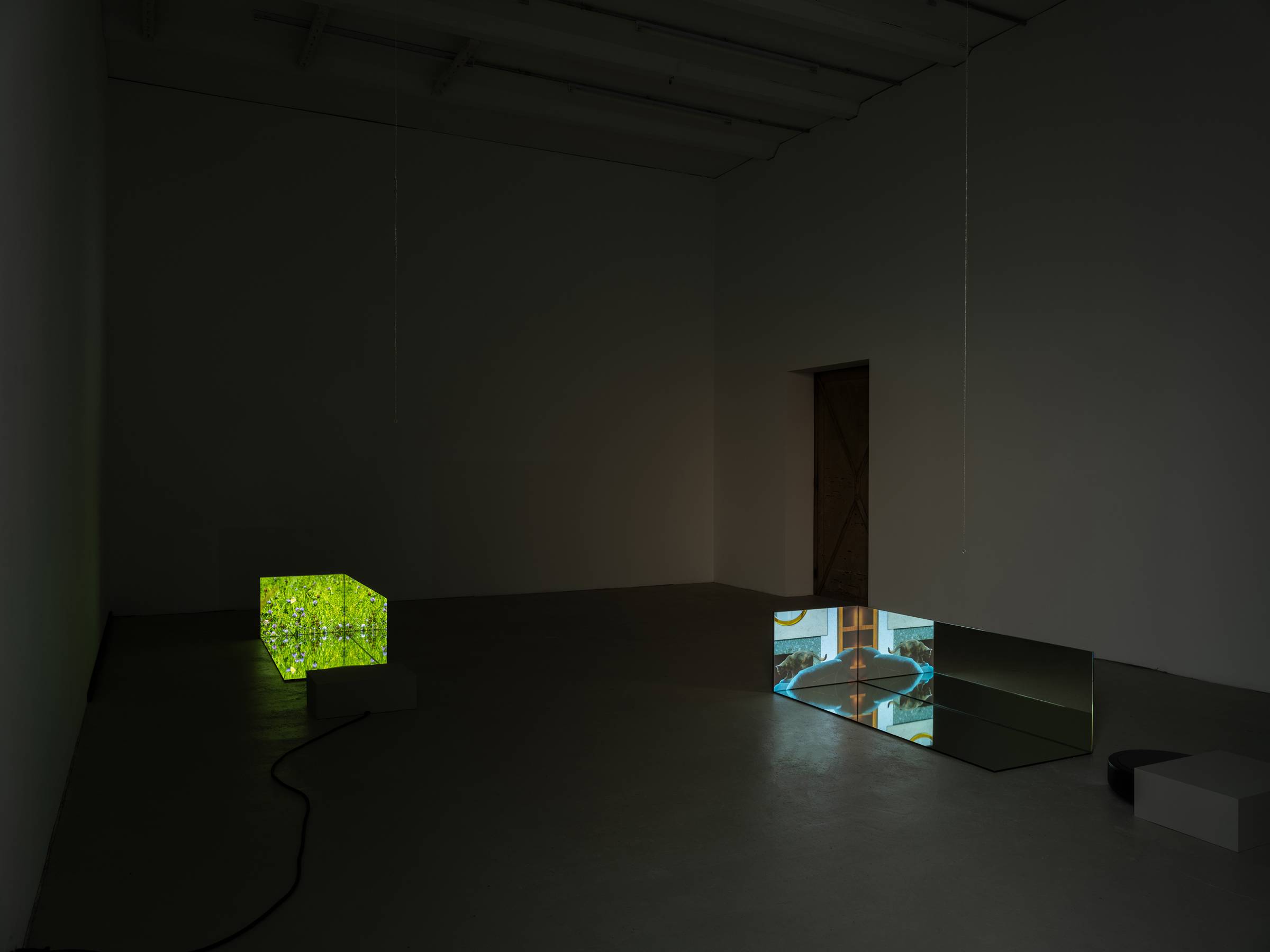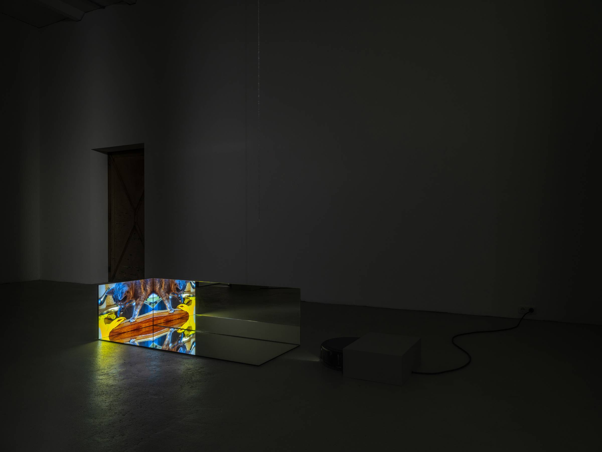 Durch die skulpturale Einbettung der fünf Videokanäle in die verspiegelten Raumrelikte generieren die Bilder immer wieder neue Muster, die auch ihre unmittelbare Umgebung in Beziehung zum Gezeigten setzen. Die Videos werden punktuell von kurzen Sequenzen früherer Arbeiten durchzogen, in denen die Verhaltensweisen anderer Tiere wie Hühner oder Käfer im Mittelpunkt stehen. Vor den projizierten Bildern hängen auf unterschiedlichen Augenhöhen von der Decke herab Metallketten, an denen Zerstreuungslinsen befestigt sind. Je nach Blickwinkel greifen sie in die Projektionen ein, komprimieren einzelne Bildausschnitte und verschieben so den Fokus des Geschehens. Auf subtile Weise erweitert Ramić damit das narrative Gefüge der Ausstellung und verschränkt vermeintlich objektive Geschichtsschreibung mit subjektiver Erfahrung. So bindet sie nicht nur ihre persönliche Auseinandersetzung mit ihrer postmigrantischen Biografie in die unterschiedlichen historischen und geografischen Kontexte ein, sondern macht gleichzeitig auch den fortlaufenden Prozess ihrer künstlerischen Reflexion sichtbar sowie die Umgebung und Perspektive der Betrachtenden.